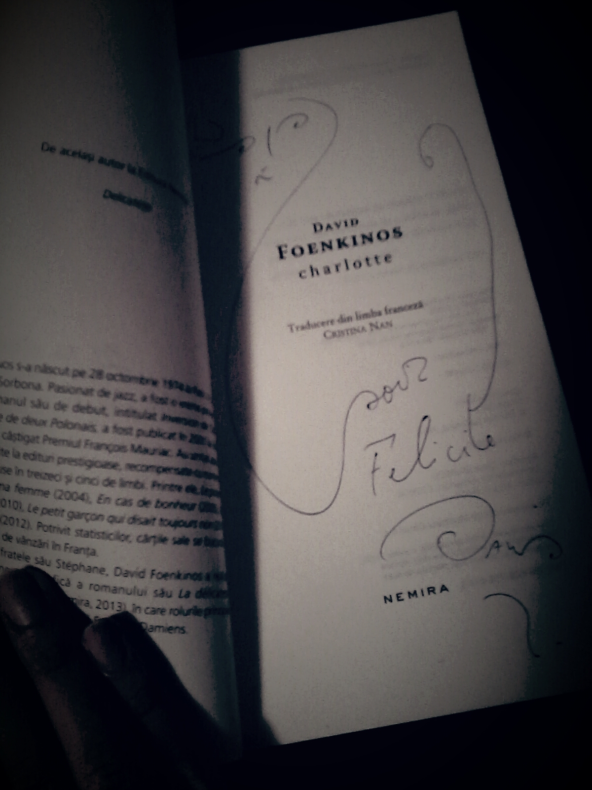Vă pot spune că Charlotte este o carte specială, scrisă într-o formă deosebită – nici nu putea exista alta care să îmi placă și să mă atragă mai mult, având în vedere că eu prefer modul „scurt și la obiect”. Este un roman, așa e considerat, dar rândurile scurte, urmate ceeel mai adesea de „ . ”, condensate, precise, care spun esențialul, invitând însă la meditare, te fac să te întrebi dacă opera lui Foenkinos nu e un imens poem.